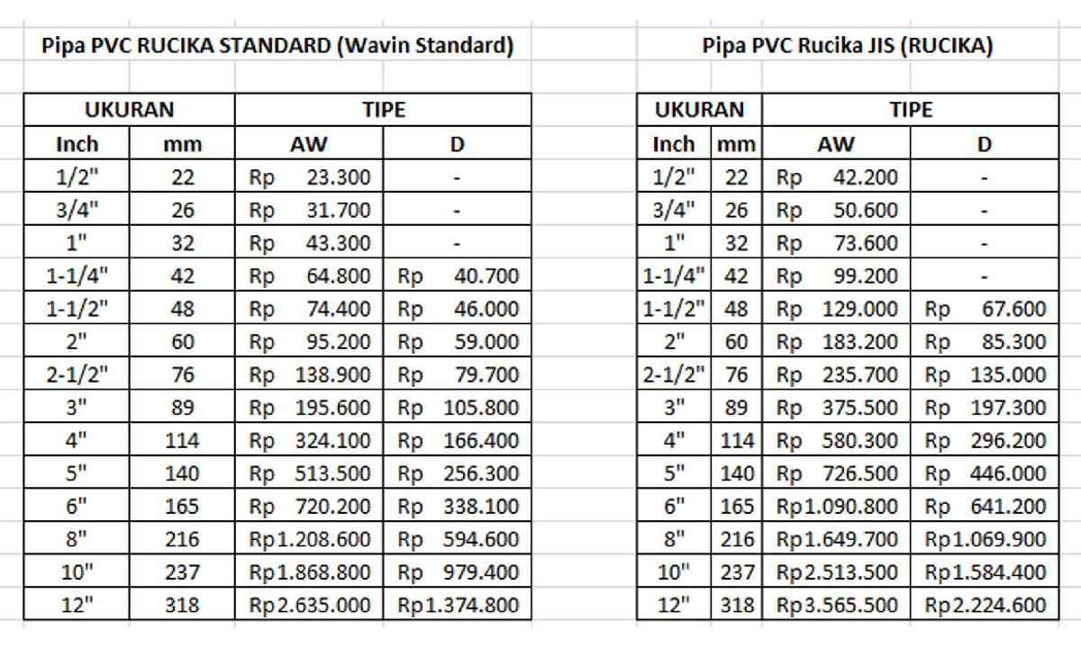 Berikut daftar harga Pipa PVC Rucika tahun 2023: