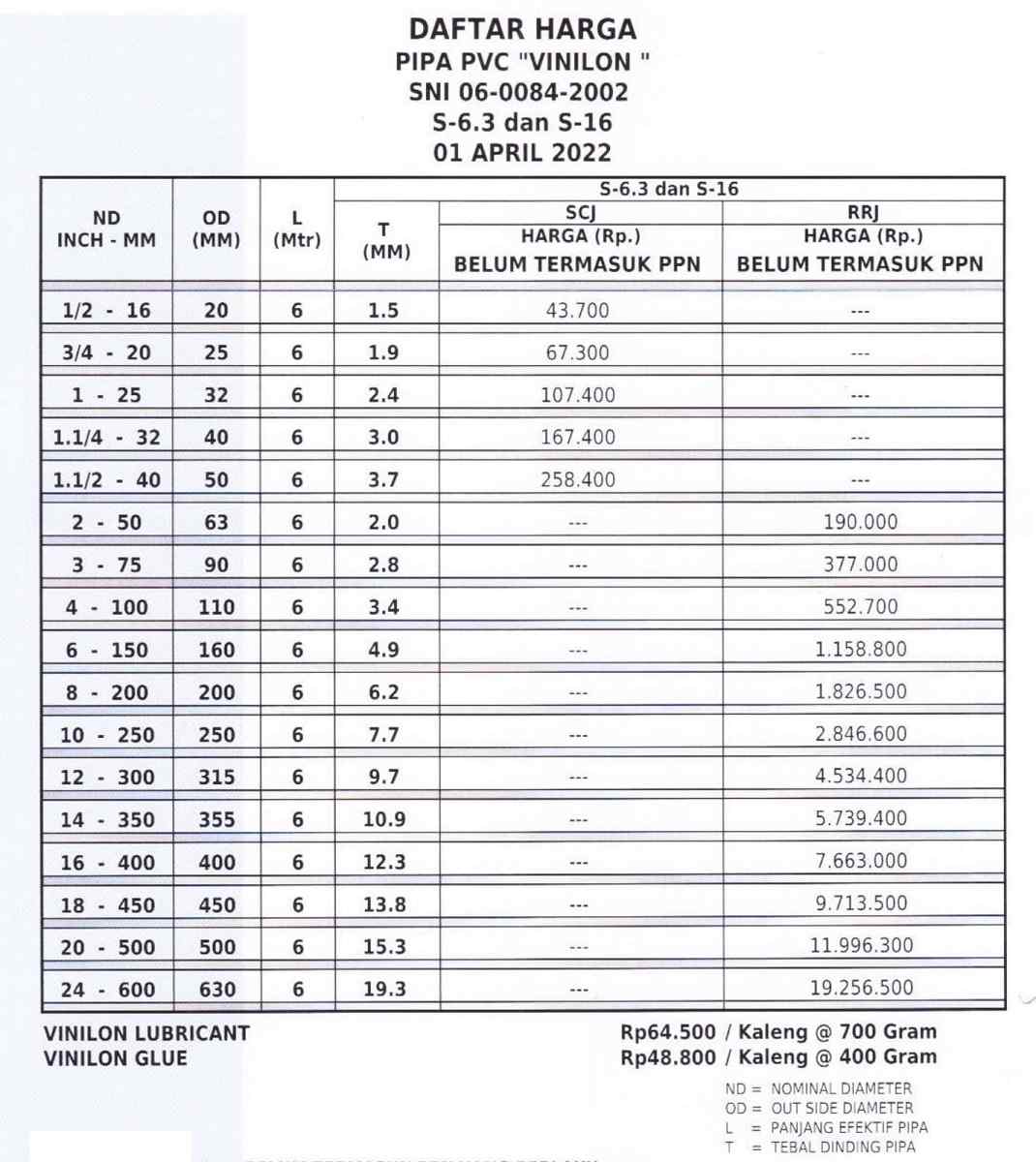Berikut daftar harga pipa PVC Vinilon tahun 2023: