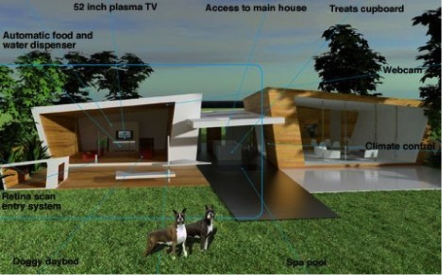 Desainnya mirip rumah Mediterania, dilengkapi dengan kamar anjing terpisah, area makan, sistem sirkulasi udara, dan pengontrol suhu.