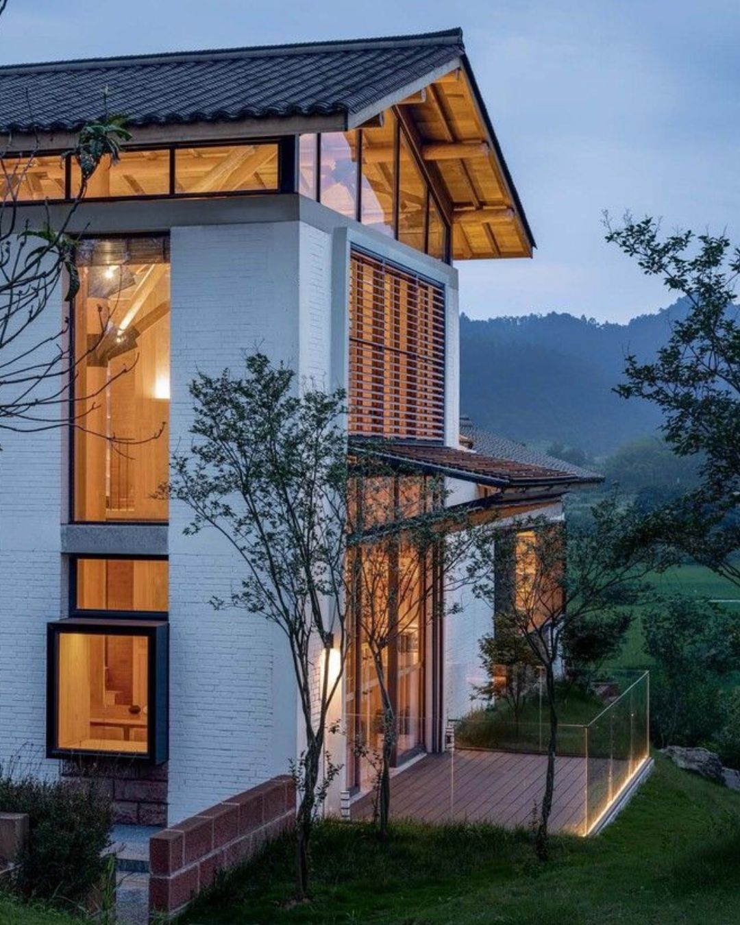 Ujungnya ditopang oleh kayu sehingga memberikan kesan autentik dan hangat. Sedangkan desain ala modern tampak jelas pada jendela besar dan pintu kacanya.