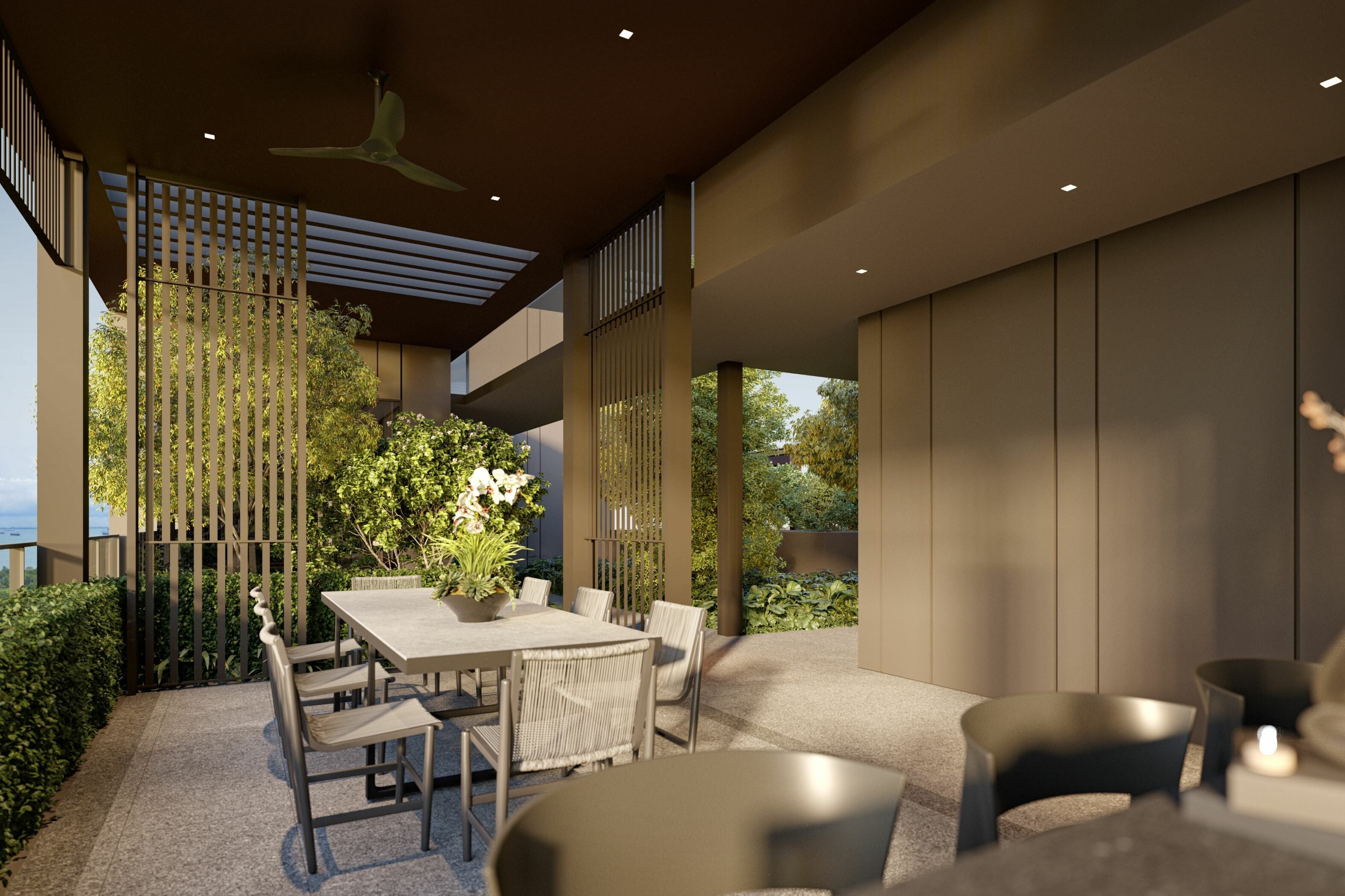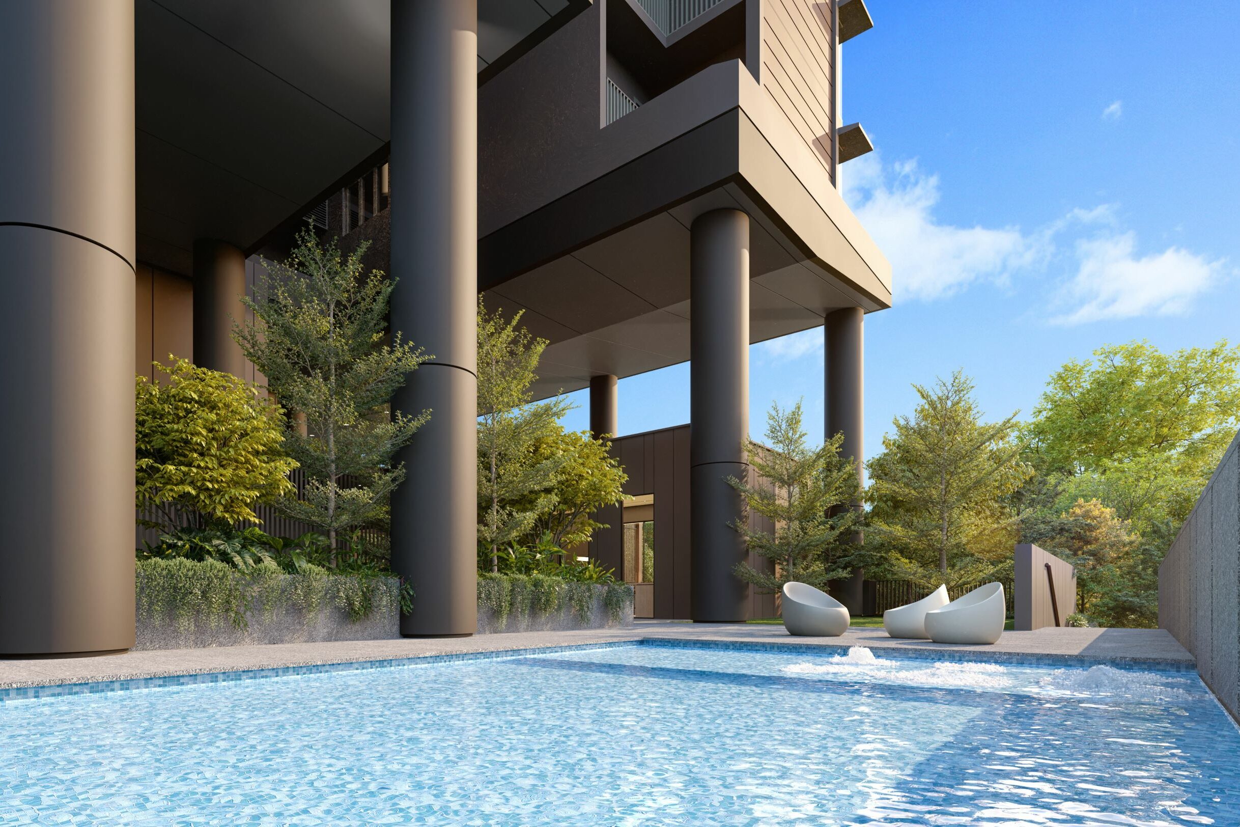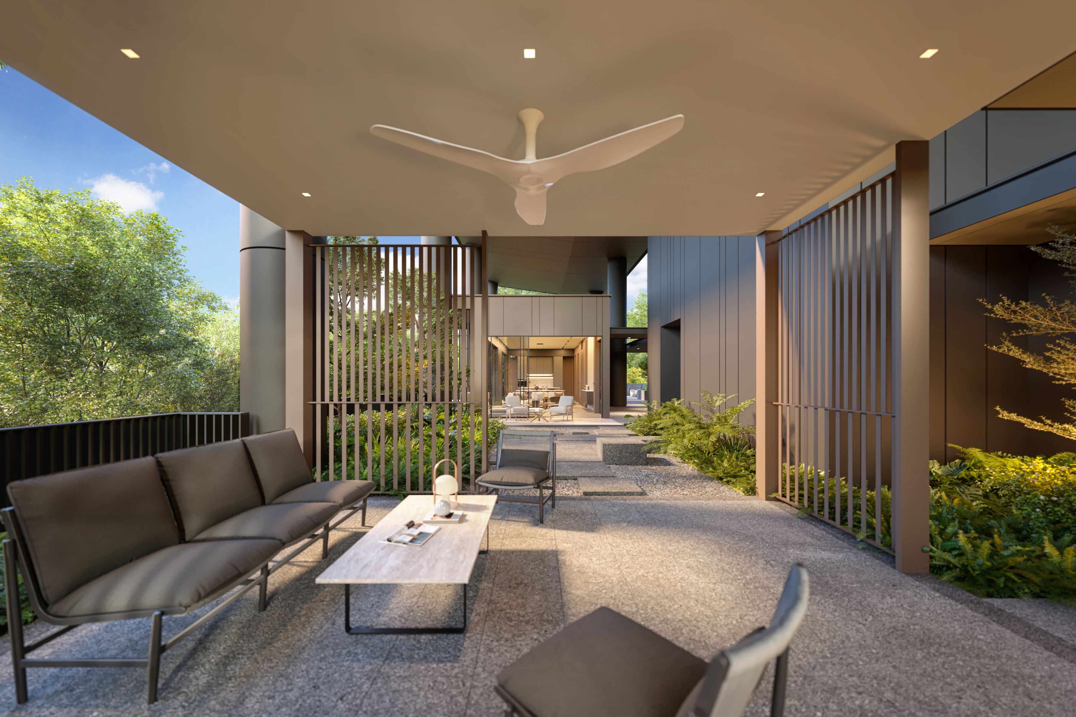 Amber House draws architectural inspiration from the old villas and raised bungalows that once lined Singapore’s East Coast. The development is lifted about 12 metres above street level, a deliberate choice that not only softens traffic noise but also creates a sense of seclusion. Elevated living in this context isn’t just about views; it’s about atmosphere. The idea is to evoke the breezy resort feel of yesteryear while still delivering the comforts of modern city life.